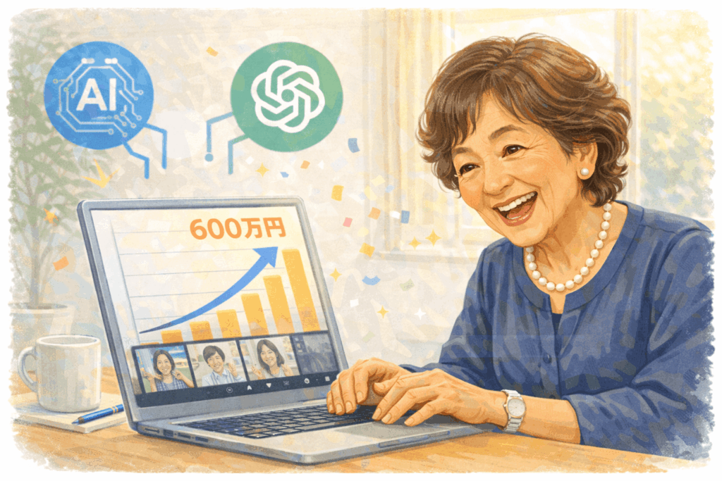 しかし、そんな状況から『AI自動集客の学校』で学び、実践を重ねた結果、83際でオンライン売上600万円を達成します。