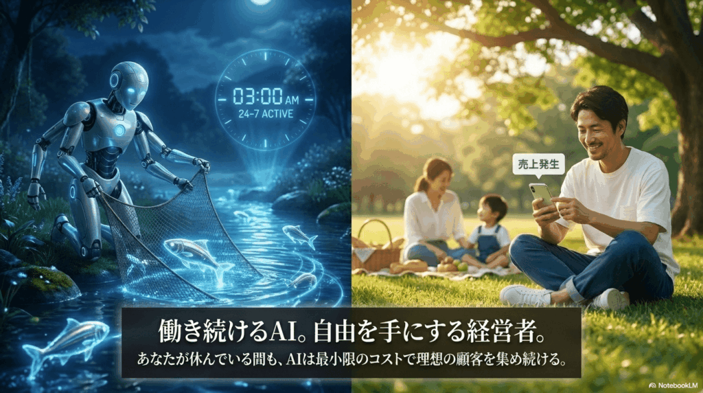あなたが寝ている間も、家族と旅行している間も、理想のお客様を自動で見つけ出し、あなたの元へ案内してくれる仕組みを作ることができるのです。