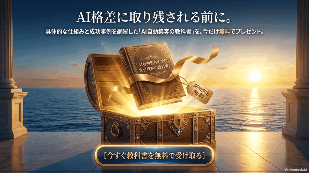 現在、期間限定で「AI自動集客」の具体的な仕組みや、実際に成果を出している事例をまとめた教科書を「無料で」プレゼントしています。